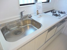 キッチンも扉とおなじくうすーい木目のような柄で統一されていてオシャレです。
