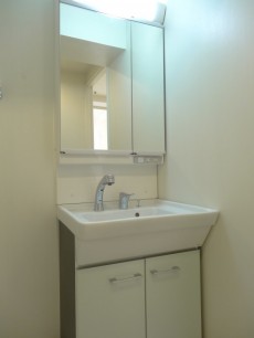 洗面台は二面鏡タイプ。洗面台下収納と合わせて収納スペースも十分です。