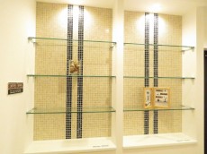 ガラス棚×タイル×間接照明の組み合わせがオシャレですね♪何を置こうか考えるのも楽しみです。