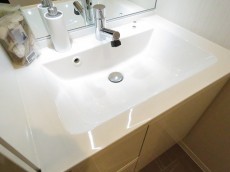 洗面化粧台は鏡の裏、引き出し、リネン収納と収納スペースが豊富。
