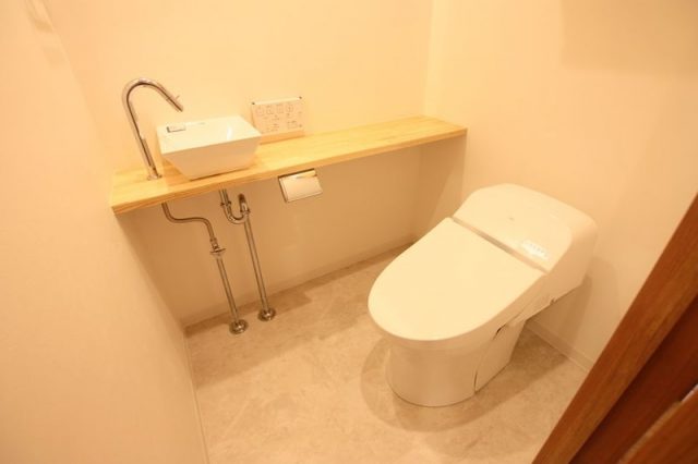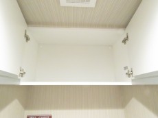 洗面室のお隣はトイレ。ウォシュレットとペーパーのストックを仕舞うのに便利な吊戸棚がついています。