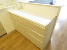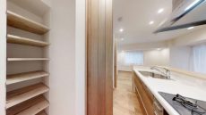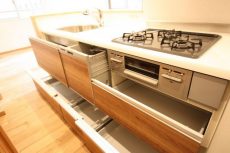 キッチンはフローリングに馴染む木目柄。対面式ではありませんが、カップボード越しにリビングの様子が見えるので家族と会話を楽しみながらお料理ができます。