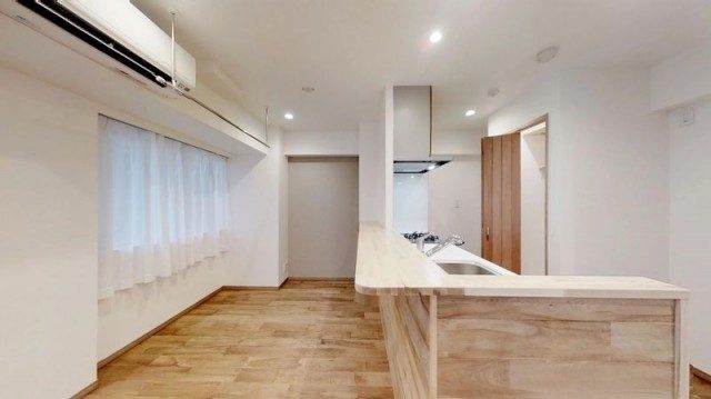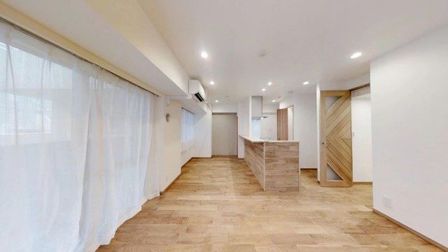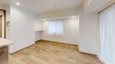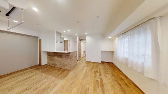 LDKは約16.0帖の縦長空間。壁面の一部にはアクセントクロスが使用され、デザイン性に優れた空間となっています。窓は南向きです。