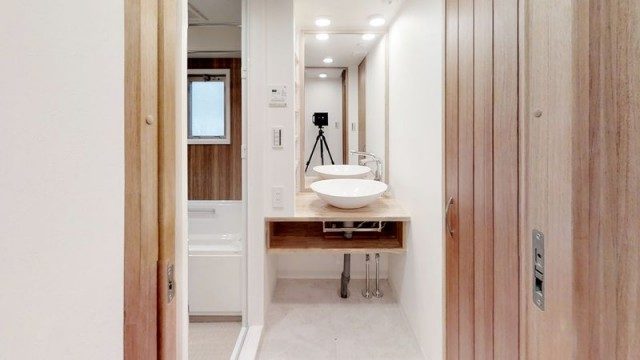 洗面室。洗面化粧台とバスルームがまとまっています。