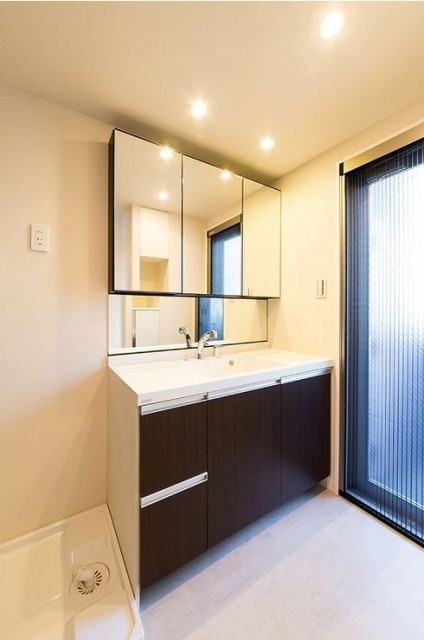トイレの正面はサニタリールームです。洗面台・洗濯機置場・バスルームが一緒になっているので、お洗濯はラクラクですね☆