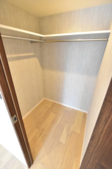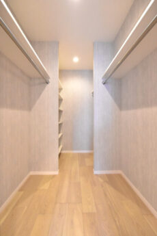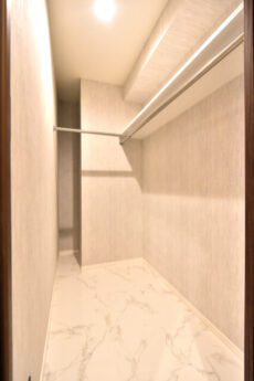 さらに、入って右側のドアはシューズインクローゼット!!!といっても棚などはなく、ハンガーポールがL字型に設置されただけのフリーな収納です。棚を設置して靴を置いてもいいですし、スーツケースやゴルフバッグなどのかさばるものを入れておくにもよさそうですね。