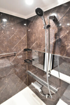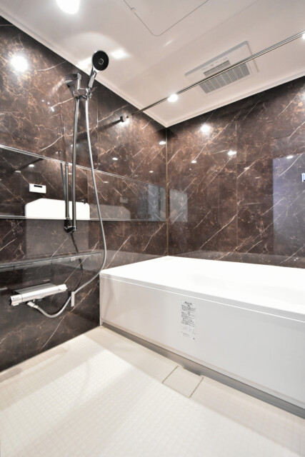 浴室はダークなストーン調でスタイリッシュな印象。ホテルライクな空間で一日の疲れを洗い流しましょう!