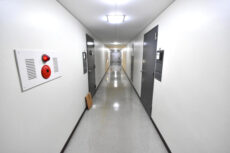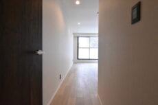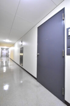 エレベーターホールからは内廊下を進みます。内廊下天候の影響を受けず、防犯面でも優れているんですよ。距離を空けて並んでいるドアの一つが今回ご紹介するお部屋になります。