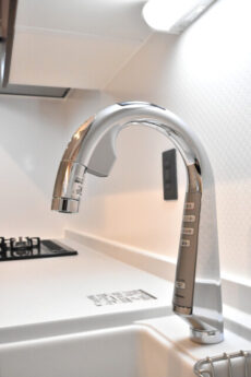 水栓はお洒落なグースネック。浄水機能一体型で気軽に美味しいお水を使うこともできますよ。