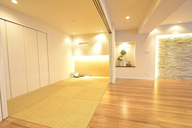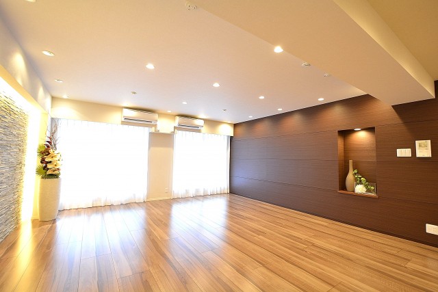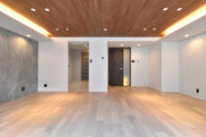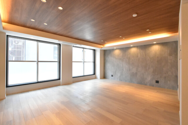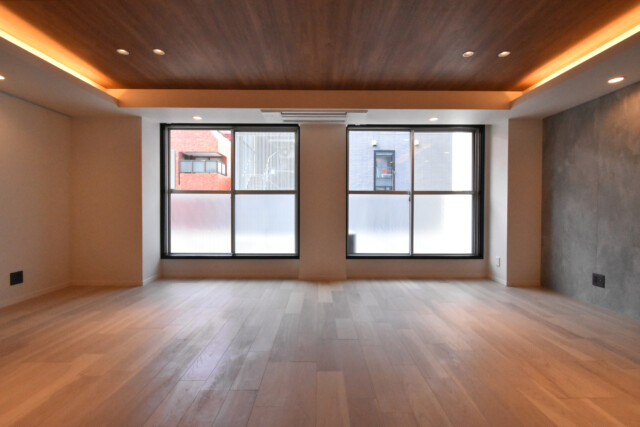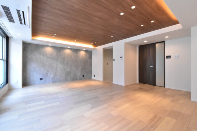 西向きのバルコニーに面したワイドスパンのお部屋です。壁いっぱいの大きな窓から外の光が入る明るい雰囲気。折り上げ天井にも木目が使われ、広いながら包み込まれるような心地良い空間になっています。
