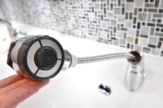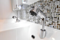 水栓はハンドシャワータイプ。ヘッドが伸びてボウルを流したりに便利です。また、
