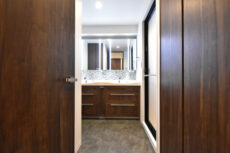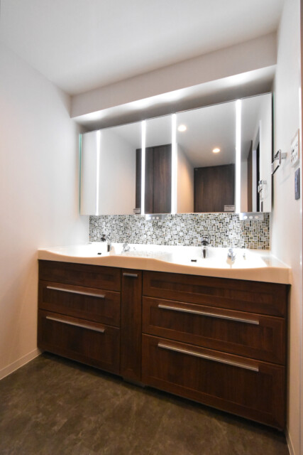 洗面化粧台はダブルボウル!!!二人並んで使うことができて忙しい朝にも安心です。鏡は・・・五面鏡?開き方で後ろが見られるのは左側だけのようですが圧巻ですね。鏡と鏡の間にはLEDライトが付けられていて影にならなくて便利ですよ。温かみのある木目パネルにも高級感を感じます。