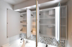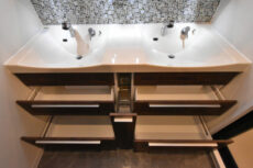 収納は洗面台下のスライドキャビネットと鏡裏のミラーキャビネット。幅があるので収納力は抜群です。