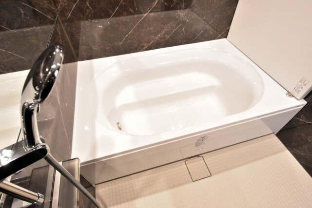 1620サイズの浴室ならではのゆとりの浴槽。設けられた段差が、寝そべった時に腕を乗せたり、半身浴の時に腰掛けたりといい働きをしてくれそうです。