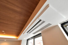 エアコンは天井にビルドインでスッキリ。余計な出っ張りで素敵な雰囲気を壊すこともありません。床には床暖房が設置されているので、エアコン暖房が苦手な方でも快適に過ごすことができますよ。かく言う私も、火照った感じがしてエアコン暖房苦手なんですよね(^-^;
