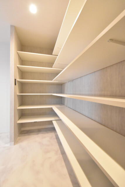 可動棚がズラッと並び、一番奥の左側は棚のないスペースになっているので、背の高いものなども置けそうです。