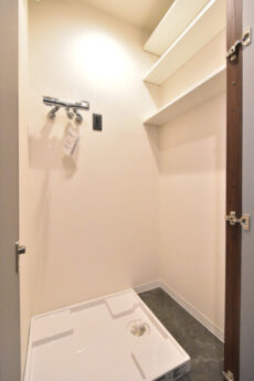 洗濯機スペースには扉付き。中には照明や棚が付いていて使い勝手も良好です。洗面室はプライベートな空間のように思われがちですが、実はお客さんが手を洗ったりするために立ち入ることも。洗濯物で溢れた洗濯機なんてうっかり見られたくないですよね。