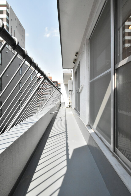広さは12.91㎡、西向き。三部屋にまたがるとにかく幅の広いバルコニーです。庇がバルコニーより狭く空が広く見えるので開放的に感じます。ご覧の通りお昼からは陽当たり良好!お洗濯物も気持ちよく乾きそうですね。(3月の13時頃です)