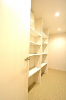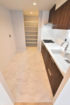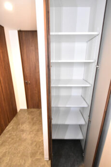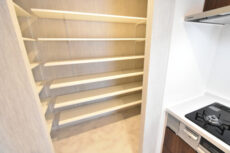 更に、キッチン奥にはパントリーも付いています!!!食品ストックから調理器具まで幅広い収納に使用可能。マメにこちらへ戻せばキッチンの作業スペースも広く使えますよ。ここへはキッチンからの他に、玄関横のドアからでも入れます。買い物から帰ってリビングを通らず荷物を処理できるのは嬉しいですね。