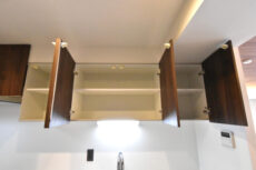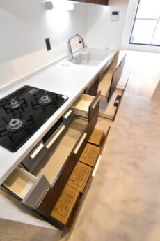 収納はスライド式のキャビネット。開口部が上なので出し入れも楽々、入れたものの確認がしやすいのも有難い収納です。上部の吊戸棚は多少出し入れがしづらいのであまり使わないものを入れるのがオススメ。土鍋やカセットコンロ、セイロなんかが入っているイメージです。