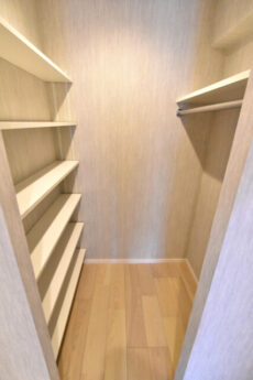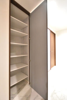 左側は何もないフリーなスペース。天井までの高さを生かして長さや高さのあるものの収納に使えますね。コンセントも付いているので、スティッククリーナーなどを置いておくにもよさそうです。右側は収納棚。
