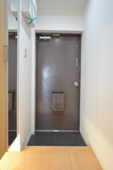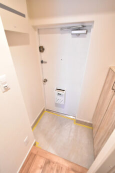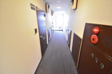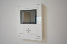 お部屋の玄関前に到着です。インターホンはモニター付き。室内のモニターで来訪者の確認ができるのは女性の一人暮らしの場合でも安心できます。
