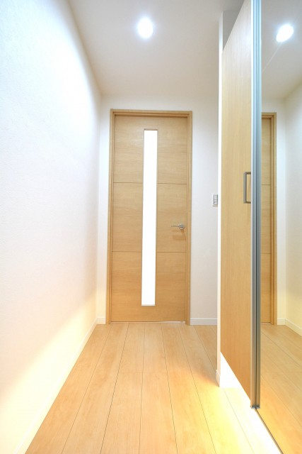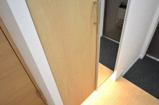 廊下をあがってすぐ右側に設置されたシューズBOXはトールサイズ。一人分の靴ならまとめてこの中に納まりそうです。表扉の半分には縦長の鏡がついているのでお出かけ前の身だしなみチェックもサッと済ませられます。便利ですね。