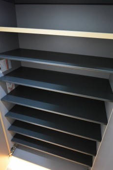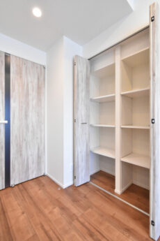 リビングダイニングには扉が3つあります。入り口に近い側の扉の中は収納になっています。かなりの容量がある可動棚付きの収納です。リビングで使うものや掃除道具等、使い勝手によって様々なものを収納可能です。