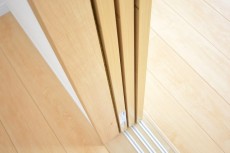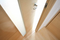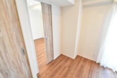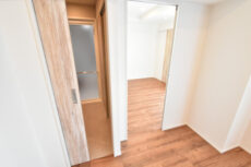 凹凸がなくスッキリとした形状のお部屋は明るく、実際よりも広く見えるような気がします!そういえば、このお部屋には出入り口・ウォークインクローゼットを含め3箇所に引き戸があるのですが…