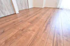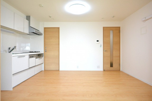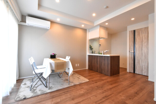 白いクロス&キッチン、ナチュラルな色合いのフローリングの明るいダイニングキッチン。