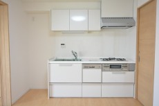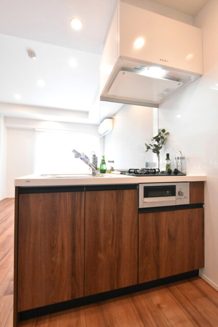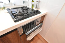 キッチンです。コンパクトな家具調で、コンロ前の衝立はガラスとなっており開放的です。
