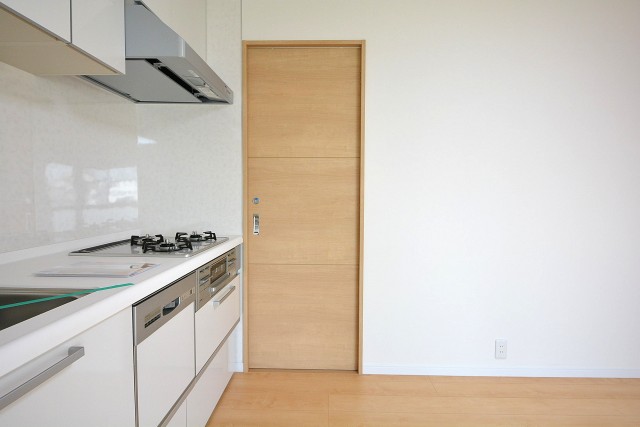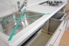 キッチンは食洗機、3口コンロ、収納たっぷりと機能的です。冷蔵庫は向かって左側の空いているスペースに置けるようになっています。