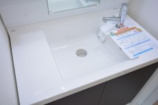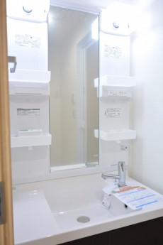 洗面化粧台です。三面鏡上部に照明が設置されているのでとても明るいです。