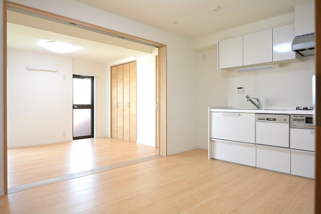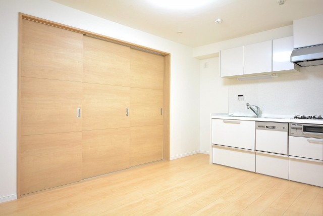 扉をあけてダイニングキッチンとベッドルームをつなげるとワンルームのような感じになりました。普段はあけたままで利用してもよさそうです。