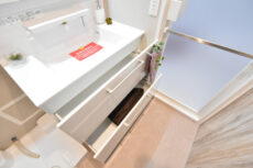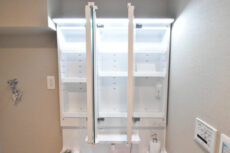 三面鏡の裏は全て収納です。これだけ収納があると、小物でゴチャゴチャしがちな洗面周りもスッキリと片付けできそうです。生活感もシャットアウト(笑)