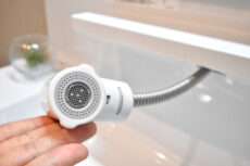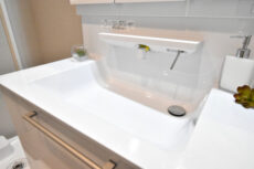洗面化粧台の蛇口はシャワーに切り替え可能、かつ引き出すことが可能となっております。洗面ボウルはシームレスで余計な継ぎ目等がないので、清潔に保つことができますね。