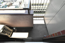 奥行きのない場所は室外機置場として利用されています。奥行きのある部分に置き型の物干しをおけば洗濯物が気持ちよく乾いてくれそうな、なかなか日当たりの良いバルコニーです。