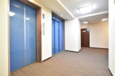 内廊下は絨毯貼りです。場所柄、事務所の表札も目立ちます。