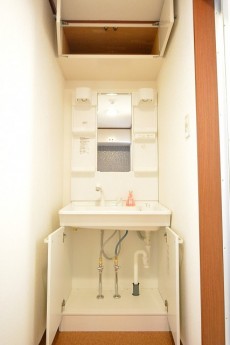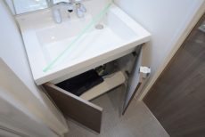 洗面ボウルの下と鏡の上にも収納スペースがあるので日用品のストックも仕舞っておけます。
