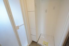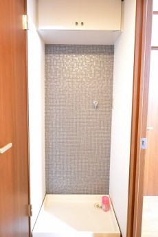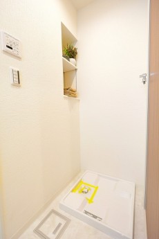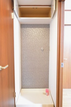 すぐ右には、洗濯機置場。壁はタイル調のデザインクロスです。吊棚が設置されていますので、洗剤や洗濯グッズを入れておくのによさそうです。