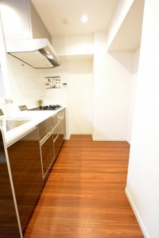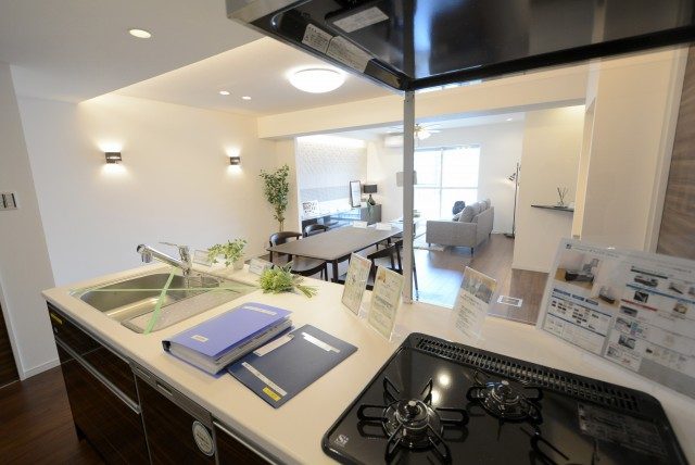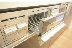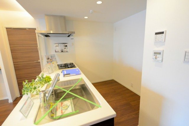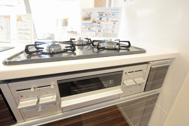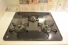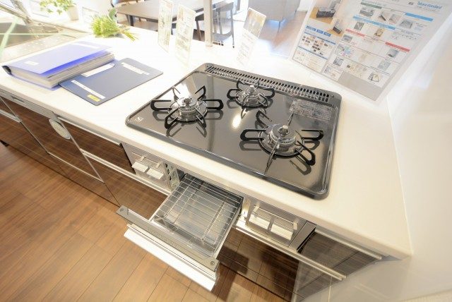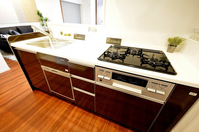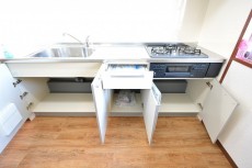 設備は三口ガス、グリルや浄水器一体型水栓に食洗機も付いていて充実しています。