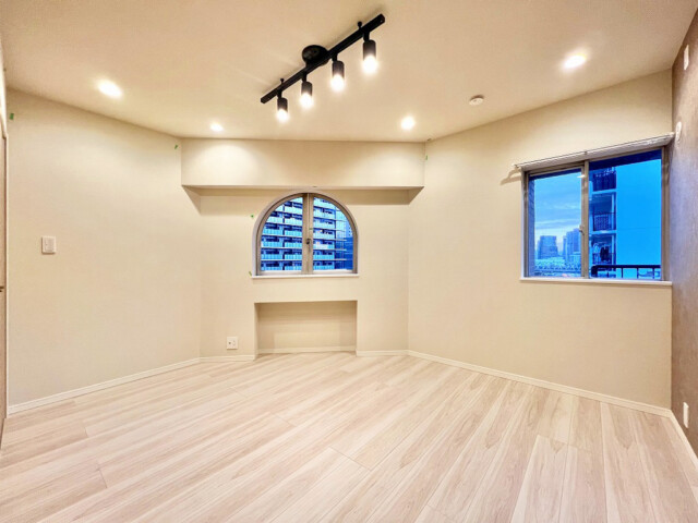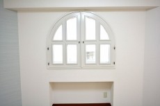 角のひとつがカットされたような五角形のお部屋で、斜めの部分には上部がアーチ状になった窓が付けられこの部屋一番の特徴になっています。ただし、家具のレイアウトには多少頭を使うかもしれませんね。
