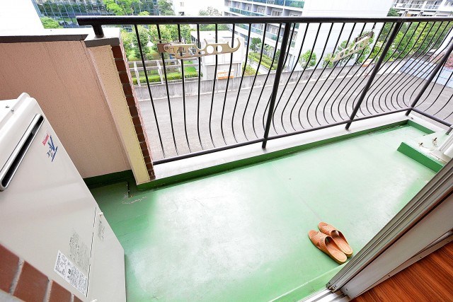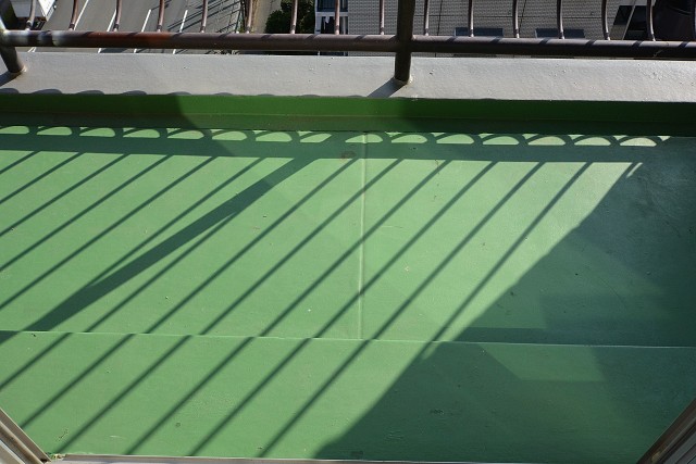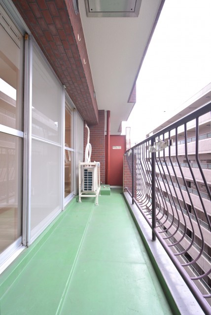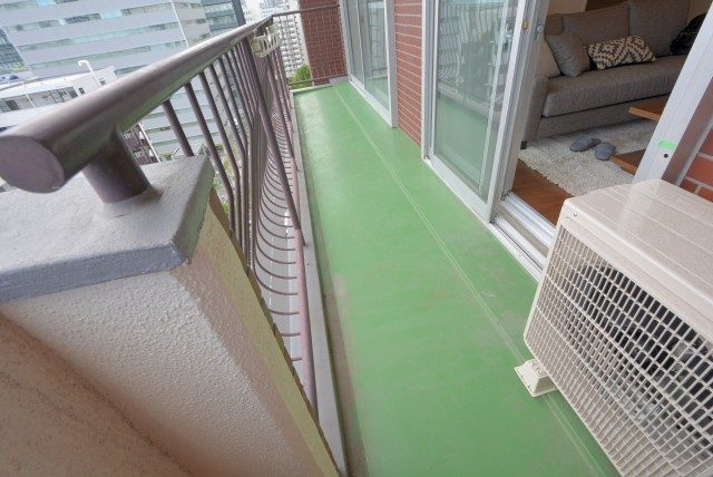 ほぼ南向きでご覧のとおり陽当たりも◎。バルコニーの床は優しい緑色です。