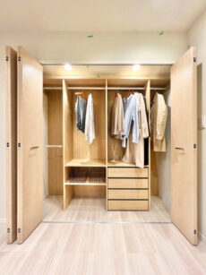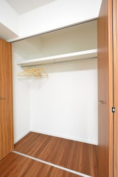 収納は大きなクローゼット。ハンガーパイプや棚、引き出しなどが付いていて洋服をバランスよく収納することが可能です。奥行きがあって手前に背の高いものが入るのも有難いですね。