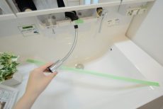 洗面室には洗面化粧台、浴室、リネン棚、洗濯機スペースがまとまっていて脱衣スペースも兼ねています。洗面化粧台は身だしなみチェックに便利な三面鏡付き。上部に照明が付いているので影になったりもしませんよ。裏のキャビネットには細かい物をしまっておくのに便利です。