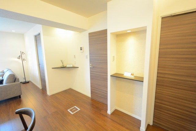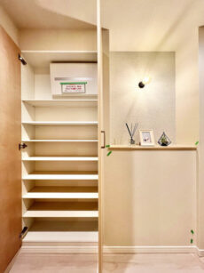 入ってすぐ左には大きなシューズインクローゼット、右側にはシューズボックスまで付いています。これだけあればどんな靴好きの方でも大満足ですね。靴で埋まらなければそれ以外のものを入れておいても良さそうです。ニッチカウンターにはいろいろ飾ってお客様をお出迎えすることも出来ますよ。
