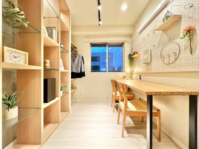 デスクや棚、オープンクローゼット、有孔ボードなどが造り付けになったお部屋です。書斎として在宅ワークや勉強に使ったり、趣味のお部屋としてコレクションでいっぱいにしたりとライフスタイルによって自由に使えるのは嬉しいですね。