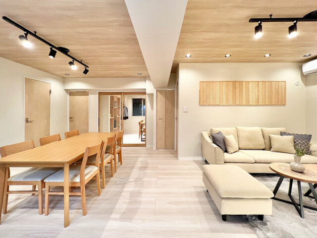 天井にも木目パネルを使用した落ち着いた雰囲気のお部屋です。六人掛けのダイニングテーブルも余裕とは!さすがに20帖近いとゆとりがありますね。梁がちょうどいい位置にあってダイニングとリビングのゾーンニングに一役買っています。