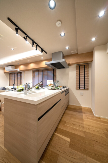 こちらは開放的な対面式キッチンです。キャビネット部分は全体的に木目で統一されているため、まるで家具のような雰囲気で空間に溶け込んでいます。