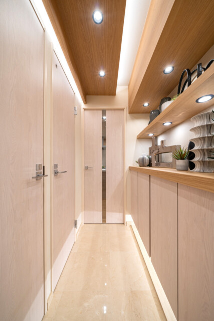 廊下右側に連なっている棚、こちらは上部が飾り棚、下部はシューズボックスとなっております。全体的に統一感があるとお部屋もスッキリとして見えますね!